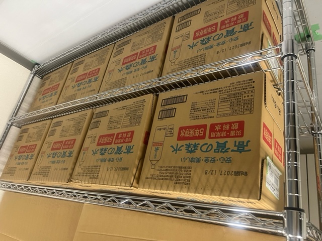 災害時の備蓄品として水と食料(全社員2日分)、毛布、簡易トイレを配備しました。